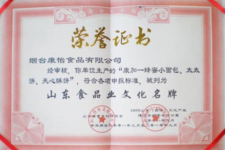 2008 年山东(国际)文化产业博览会,于 2008 年 9 月 27 日 — 29 日,在济南国际会展中心隆重召开。饮食文化展区是本届文博会的重要组成部分,重点展示了食品业、餐饮业历史悠久的老字号品牌,表彰了一批知名度高、影响力广泛的行业文化名牌。我单位生产的“康加一蜂蜜小面包、太太饼、夹心酥饼”被 2008 年山东国际文化产业博览会组委会,评审为“山东食品业文化名牌”。