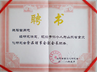 山东省食文化研究会授予魏总的聘书