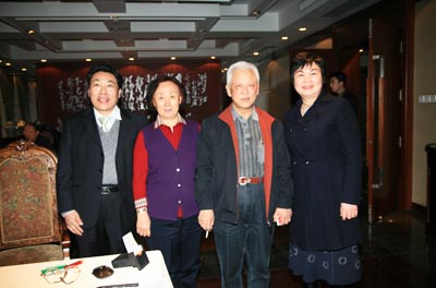 日晚,全国人大常委会副委员长周铁农及夫人(中)与魏总及其夫人(左一、右一)娱乐闲暇在桥牌室共同合影;