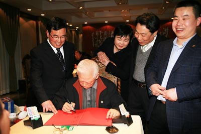 全国人大常委会副委员长周铁农(中)在桥牌室里题名留念;